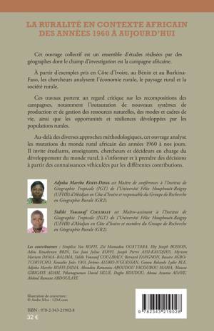 Au-delà des diverses approches méthodologiques, cet ouvrage analyse les mutations du monde rural africain des années 1960 à nos jours. À partir d'exemples pris en Côte d'Ivoire, au Bénin et au Burkina-Faso, les chercheurs analysent l'économie rurale, le paysage rural et la société rurale. Ces travaux portent un regard critique sur les recompositions des campagnes, notamment l'instauration de nouveaux systèmes de production et de gestion des ressources naturelles, des modes et cadres de vie, ainsi que les opportunités et résiliences développées par les populations rurales.