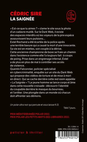 Estel Rochand a été écartée de la police après une terrible bavure qui a causé la mort d’une innocente. Sa vie est en miettes, son couple à la dérive. Cette ancienne championne de boxe se fraie un chemin dans l’existence comme elle l’a toujours fait : à coups de poing. Prise dans un engrenage infernal, Estel a de plus en plus de mal à contrôler ses accès de violence. Quentin Falconnier, policier spécialisé en cybercriminalité, enquête sur un site du Dark Web qui propose des vidéos de torture et de mise à mort en direct. Qui se cache derrière cette « red room » appelée « La Saignée » ? Le jeune homme se lance corps et âme dans cette nouvelle croisade : découvrir l’identité du coupable derrière le masque du bourreau, et l’arrêter.
