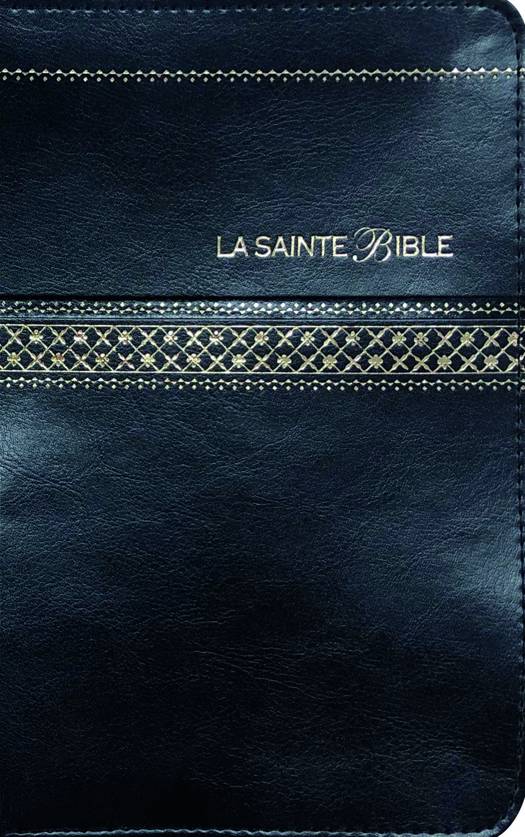 Le texte biblique dans la version Segond révisée de 1910, dans un ouvrage à onglets portant une reliure en similicuir noir, des tranches dorées et une glissière.