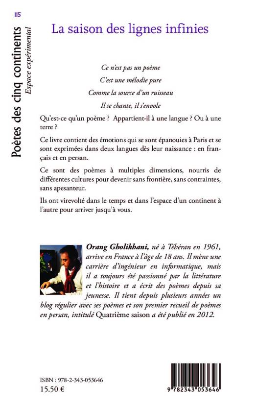Ce livre contient des émotions qui se sont épanouies à Paris et se sont exprimées dans deux langues dès leur naissance : en français et en persan. Ces sont des poèmes à multiples dimensions, nourris de différentes cultures pour devenir sans frontière, sans contraintes, sans pesanteur. Ils ont virevoleté dans le temps et dans l'espace d'un continent à l'autre pour arriver jusqu'à vous.