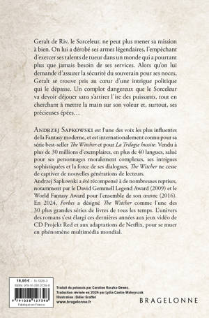 Geralt de Riv, le Sorceleur, ne peut plus mener sa mission à bien. On lui a dérobé ses armes légendaires, l'empêchant d'exercer ses talents de tueur dans un monde qui a pourtant plus que jamais besoin de ses services. Alors qu'on lui demande d'assurer la sécurité du souverain pour ses noces, Geralt se trouve pris au coeur d'une intrigue politique qui le dépasse. Un complot dangereux que le Sorceleur va devoir déjouer sans s'attirer l'ire des puissants, tout en cherchant à mettre la main sur son voleur et, surtout, ses précieuses épées...