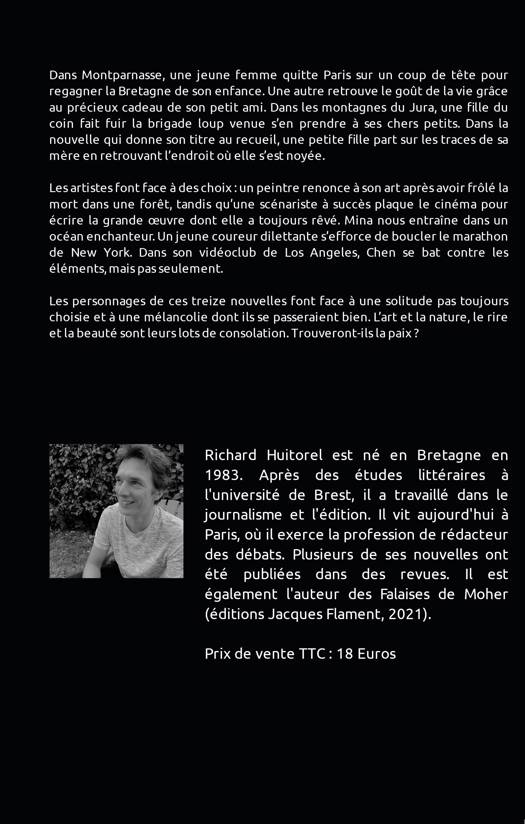 Dans Montparnasse, une jeune femme quitte Paris sur un coup de tête pour regagner la Bretagne de son enfance. Une autre retrouve le goût de la vie grâce au précieux cadeau de son petit ami. Dans les montagnes du Jura, une fille du coin fait fuir la brigade loup venue s’en prendre à ses chers petits. Dans la nouvelle qui donne son titre au recueil, une petite fille part sur les traces de sa mère en retrouvant l’endroit où elle s’est noyée. Les artistes font face à des choix : un peintre renonce à son art après avoir frôlé la mort dans une forêt, tandis qu’une scénariste à succès plaque le cinéma pour écrire la grande œuvre dont elle a toujours rêvé. Mina nous entraîne dans un océan enchanteur. Un jeune coureur dilettante s’efforce de boucler le marathon de New York. Dans son vidéoclub de Los Angeles, Chen se bat contre les éléments, mais pas seulement. Les personnages de ces treize nouvelles font face à une solitude pas toujours choisie et à une mélancolie dont ils se passeraient bien. L’art et la nature, le rire et la beauté sont leurs lots de consolation. Trouveront-ils la paix ?