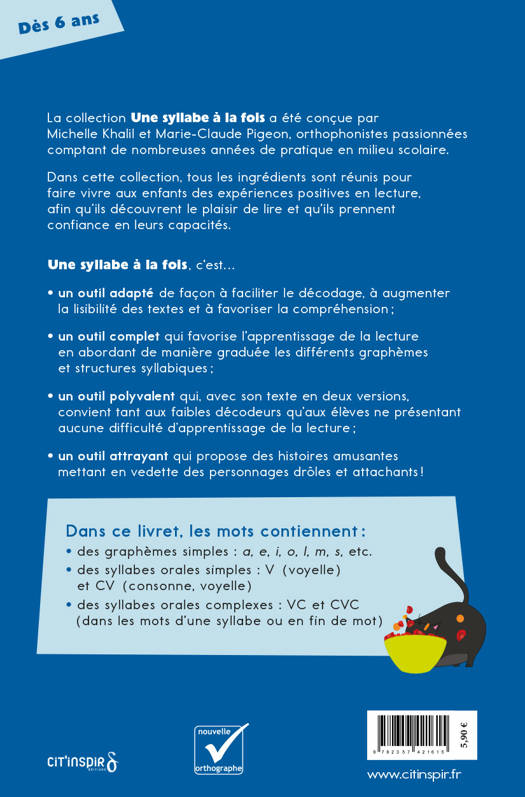 Des textes adaptés pour lire plus facilement ! Pour faciliter l’apprentissage de la lecture, les mots qui composent les histoires ont été sélectionnés en fonction de leur familiarité, de leur structure syllabique et des graphèmes* qu’ils contiennent. Plusieurs adaptations visuelles permettent de réduire la charge cognitive liée au décodage et de limiter l’encombrement perceptif. Les livrets contiennent deux fois la même histoire : dans la première version, syllabes orales, lettres muettes et graphèmes complexes sont mis en relief ; dans la seconde, ces adaptations ne sont pas présentes. Ce sont donc des outils polyvalents qui favorisent le transfert des acquis et qui conviennent à tous les enfants. Les histoires fantaisistes mettent en scène des personnages rigolos et attachants. La trame narrative captive les jeunes lecteurs tout en leur permettant de faire des prédictions. Les illustrations leur donnent aussi de nombreuses occasions de faire des inférences.