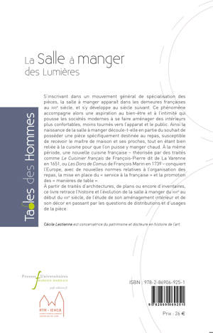 S’inscrivant dans un mouvement général de spécialisation des pièces, la salle à manger apparaît dans les demeures françaises au XVIIe siècle, et s’y développe au siècle suivant. Ce phénomène accompagne alors une aspiration au bien-être et à l’intimité qui pousse les sociétés modernes à se faire aménager des intérieurs plus confortables, moins tournés vers l’apparat et le public. Ainsi la naissance de la salle à manger découle-t-elle en partie du souhait de posséder une pièce spécifiquement destinée au repas, susceptible de recevoir le maître de maison et ses proches, tout en étant bien reliée à la cuisine pour que l’on puisse y manger chaud. À la même période, une nouvelle cuisine française – théorisée par des traités comme Le Cuisinier français de François-Pierre dit de La Varenne en 1651, ou Les Dons de Comus de François Marin en 1739 – conquiert l’Europe, avec de nouvelles normes relatives à l’organisation des repas, la mise en place du « service à la française » et la promotion des « manières de table ». À partir de traités d’architectures, de plans ou encore d’inventaires, ce livre retrace l’histoire et l’évolution de la salle à manger du XVIIe au début du XIXe siècle, de l’étude de son aménagement intérieur et de son décor en passant par les questions de distributions et d’usages de la pièce.