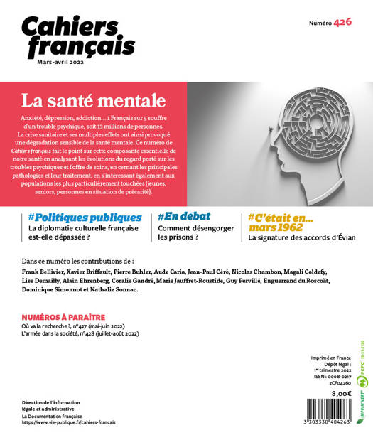 Ce numéro des Cahiers français éclaire le lecteur sur les principales pathologies mentales et les raisons pour lesquelles elles sont devenues des enjeux majeurs de santé publique.