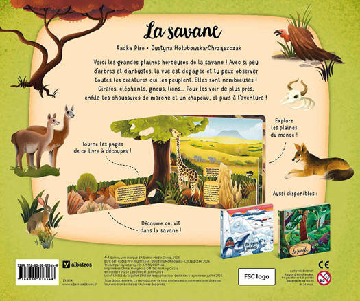 Voici les grandes plaines herbeuses de la savane ! Avec si peu d’arbres et d’arbustes, la vue est dégagée et tu peux observer toutes les créatures qui les peuplent. Elles sont nombreuses ! Girafes, éléphants, gnous, lions... Pour les voir de plus près, enfile tes chaussures de marche et un chapeau, et pars à l’aventure ! Une aventure dans la savane pour les jeunes explorateurs et exploratrices, permettant de découvrir un nouvel habitat et une faune remarquable.
