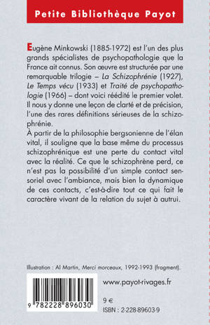 Eugène Minkowski (1885-1972) est l'un des plus grands spécialistes de psychopathologie que la France ait connus. Son oeuvre est structurée par une remarquable trilogie dont voici réédité le premier volet. À partir de la philosophie bergsonienne de l'élan vital, il souligne que le fonds même du processus schizophrénique est une perte du contact vital avec la réalité. Ce que le schizophrène perd, ce n'est pas la possibilité d'un simple contact sensoriel avec l'ambiance, mais bien la dynamique de ces contacts, c'est-à-dire tout ce qui fait le caractère vivant de la relation du sujet à autrui.