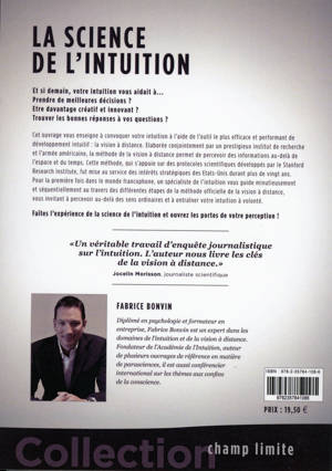 Cet ouvrage enseigne, pour la première fois dans le monde francophone, la méthode du “controlled remote viewing” (vision à distance) utilisé par le gouvernement américain à des fins d’espionnage psychique. Le lecteur est guidé, étape par étape, au travers du fameux protocole développé par le prestigieux Stanford Research Institute. Avant d’être un moyen d’espionnage, le “controlled remote viewing” est avant tout un outil de développement personnel et d’entraînement à l’intuition. Parce qu'elle mobilise l'ensemble des mécanismes (attention, intention, concentration) et les attitudes mentales (lâcher prise, détachement, confiance en soi, patience) favorisant les ressentis intuitifs, cette méthode est la plus complète pour développer l'intuition. Enfin, parce qu’elle a des fondements scientifiques et qu’elle fournit d’excellents résultats, cette méthode est la plus efficace pour entraîner l’intuition. L’ouvrage fournit également un cadre théorique en proposant un tour d’horizon des recherches scientifiques sur l’intuition et de ses applications. En investissant notamment la discipline de la physique quantique de l’information, l’auteur apporte des clefs de compréhension au phénomène intuitif ainsi qu’à la vision à distance. Faites l'expérience de la science de l'intuition et ouvrez les portes de votre perception !