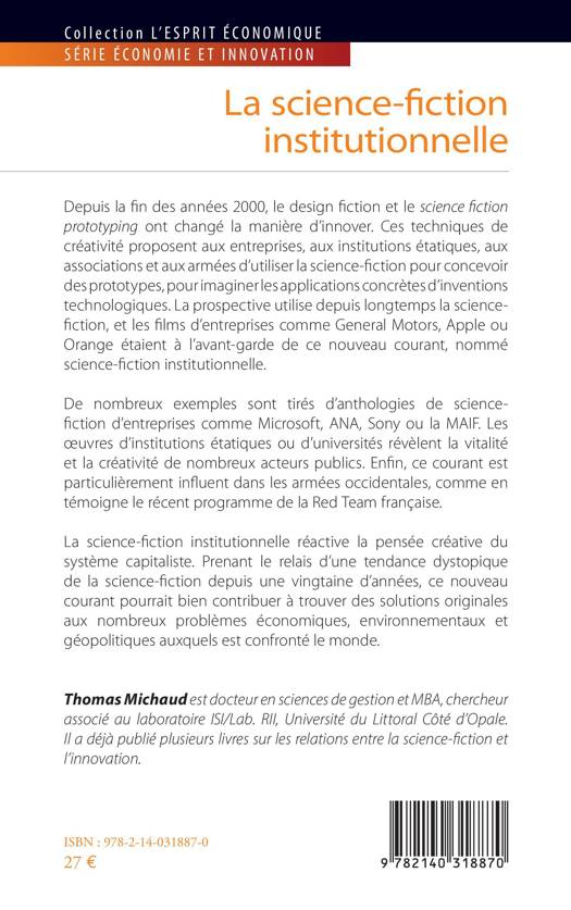 Depuis la fin des années 2000, le design fiction et le science fiction prototyping ont changé la manière d'innover. Ces techniques de créativité proposent aux entreprises, aux institutions étatiques, aux associations et aux armées d'utiliser la science-fiction pour concevoir des prototypes, pour imaginer les applications concrètes d'inventions technologiques. La prospective utilise depuis longtemps la science-fiction, et les films d'entreprises comme General Motors, Apple ou Orange étaient à l'avant-garde de ce nouveau courant, nommé science-fiction institutionnelle. De nombreux exemples sont tirés d'anthologies de science-fiction d'entreprises comme Microsoft, ANA, Sony ou la MAIF. Les uvres d'institutions étatiques ou d'universités révèlent la vitalité et la créativité de nombreux acteurs publics. Enfin, ce courant est particulièrement influent dans les armées occidentales, comme en témoigne le récent programme de la Red Team française. La science-fiction institutionnelle réactive la pensée créative du système capitaliste. Prenant le relais d'une tendance dystopique depuis une vingtaine d'années, ce nouveau courant pourrait bien contribuer à trouver des solutions originales aux nombreux problèmes économiques, environnementaux et géopolitiques auxquels est confronté le monde.