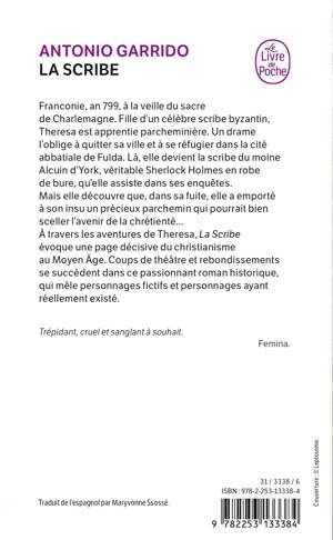 Franconie, an 799, à la veille du sacre de Charlemagne. Fille d'un célèbre scribe byzantin, Theresa est apprentie parcheminière. Un drame l'oblige à quitter sa ville et à se réfugier dans la cité abbatiale de Fulda. Là, elle devient la scribe du moine Alcuin d'York, véritable Sherlock Holmes en robe de bure, qu'elle assiste dans ses enquètes. Mais elle découvre que, dans sa fuite, elle a emporté à son insu un précieux parchemin qui pourrait bien sceller l'avenir de la chrétienté... À travers les aventures de Theresa, La Scribe évoque une page décisive du christianisme au Moyen Âge. Coups de théâtre et rebondissements se succèdent dans ce passionnant roman historique, qui mèle personnages fictifs et personnages ayant réellement existé.Trépidant, cruel et sanglant à souhait. Femina.