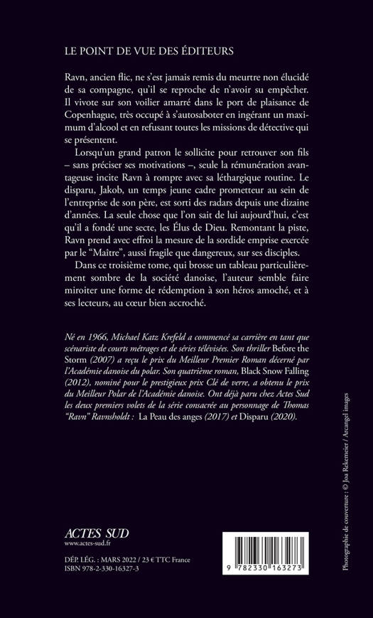 Ravn, ancien flic, ne s'est jamais remis du meurtre non élucidé de sa compagne, qu'il se reproche de n'avoir su empêcher. Il vivote sur son voilier amarré dans le port de plaisance de Copenhague, très occupé à s'autosaboter en ingérant un maximum d'alcool et en refusant toutes les missions de détective qui se présentent. Lorsqu'un grand patron le sollicite pour retrouver son fils - sans préciser ses motivations -, seule la rémunération avantageuse incite Ravn à rompre avec sa léthargique routine. Le disparu, Jakob, un temps jeune cadre prometteur au sein de l'entreprise de son père, est sorti des radars depuis une dizaine d'années. La seule chose que l'on sait de lui aujourd'hui, c'est qu'il a fondé une secte, les Élus de Dieu. Remontant la piste, Ravn prend avec effroi la mesure de la sordide emprise exercée par le "Maître", aussi fragile que dangereux, sur ses disciples. Dans ce troisième tome, qui brosse un tableau particulièrement sombre de la société danoise, l'auteur semble faire miroiter une forme de rédemption à son héros amoché, et à ses lecteurs, au coeur bien accroché.
