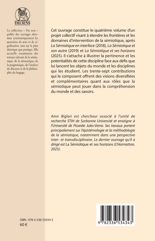 Cet ouvrage constitue le quatrième volume d'un projet collectif visant à étendre les frontières et les domaines d'intervention de la sémiotique, après La Sémiotique en interface (2018), La Sémiotique et son autre (2019) et La Sémiotique et ses horizons (2025). Il s'attache à illustrer la pertinence et les potentialités de cette discipline face aux défis que lui lancent les objets du monde et les disciplines qui les étudient. Les trente-sept contributions qui le composent offrent des visions diversifiées et complémentaires quant aux rôles que la sémiotique peut jouer dans la compréhension du monde et des savoirs.