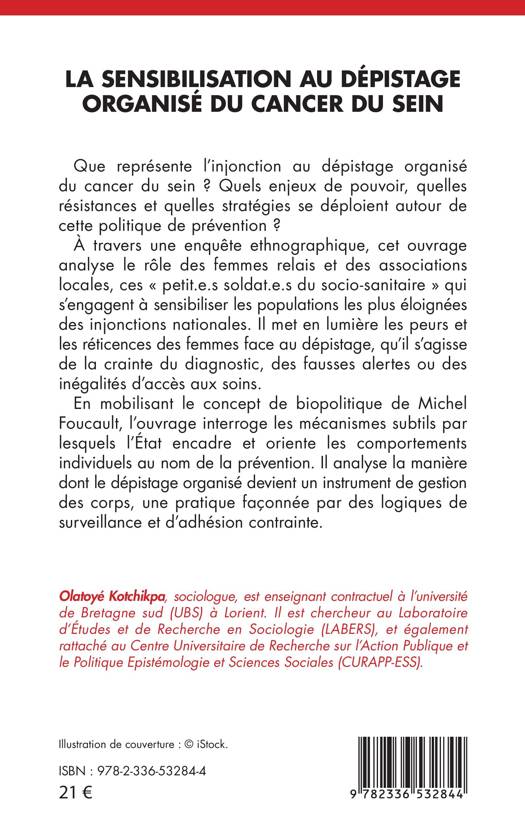 Que représente l'injonction au dépistage organisé du cancer du sein ? Quels enjeux de pouvoir, quelles résistances et quelles stratégies se déploient autour de cette politique de prévention ? À travers une enquête ethnographique, cet ouvrage analyse le rôle des femmes relais et des associations locales, ces petit.e.s soldat.e.s du socio-sanitaire qui s'engagent à sensibiliser les populations les plus éloignées des injonctions nationales. Il met en lumière les peurs et les réticences des femmes face au dépistage, qu'il s'agisse de la crainte du diagnostic, des fausses alertes ou des inégalités d'accès aux soins. En mobilisant le concept de biopolitique de Michel Foucault, l'ouvrage interroge les mécanismes subtils par lesquels l'État encadre et oriente les comportements individuels au nom de la prévention. Il analyse la manière dont le dépistage organisé devient un instrument de gestion des corps, une pratique façonnée par des logiques de surveillance et d'adhésion contrainte.