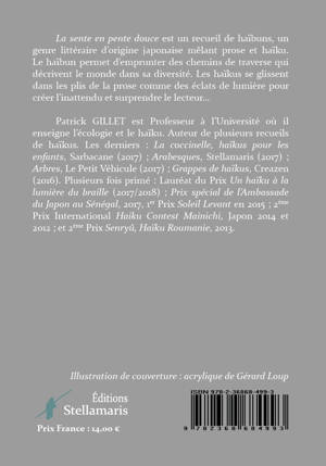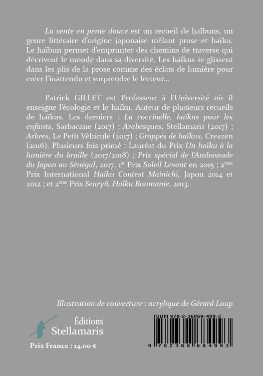La sente en pente douce est un recueil de haïbuns, un genre littéraire d’origine japonaise mêlant prose et haïku. Le haïbun permet d’emprunter des chemins de traverse qui décrivent le monde dans sa diversité. Les haïkus se glissent dans les plis de la prose comme des éclats de lumière pour créer l’inattendu et surprendre le lecteur…