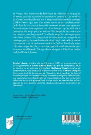 En France, nous manquons de données et de réflexions sur la question du temps dans les situations de séparation parentale. Les membres du Conseil interdisciplinaire sur la responsabilité parentale partagée (CIRPA-France) qui sont des scientifiques et des professionnels de la famille, se sont ici demandé comment traiter cette question. De nombreuses interrogations ont alors émergé: qu’en est-il de la perception du temps pour les enfants ? Du temps de la construction des relations avec les parents ? Du rôle du temps lors des séparations avec leurs parents ? Du temps pour les institutions en charge de les accompagner ou de prendre des décisions ? Agir avec célérité semble fondamental pour répondre aux besoins de l’enfant. Prendre le temps d’écouter, de pacifier, de coconstruire apparaît toutefois essentiel pour surmonter les différends. Entre prudence et urgence, l’équilibre semble parfois difficile à trouver.