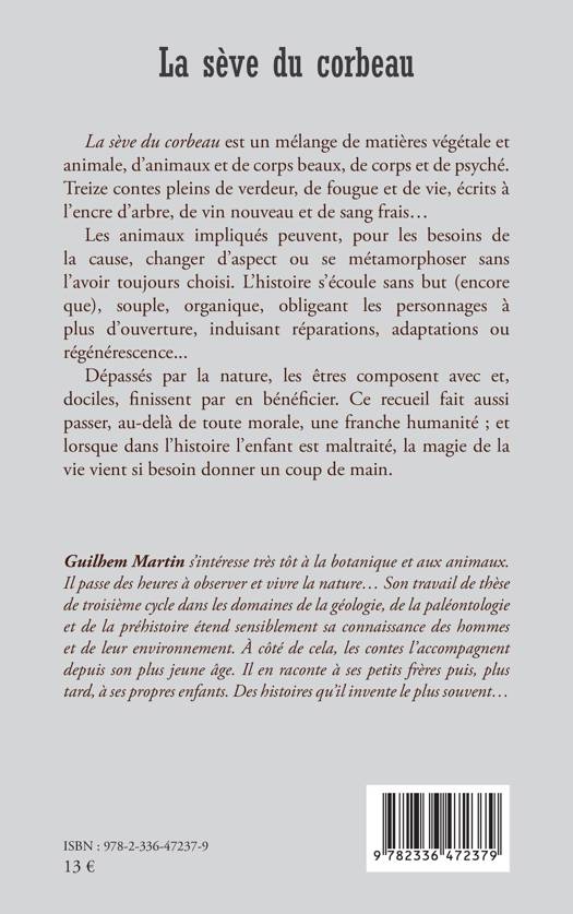 La sève du corbeau est un mélange de matières végétale et animale, d'animaux et de corps beaux, de corps et de psyché. Treize contes pleins de verdeur, de fougue et de vie, écrits à l'encre d'arbre, de vin nouveau et de sang frais... Les animaux impliqués peuvent, pour les besoins de la cause, changer d'aspect ou se métamorphoser sans l'avoir toujours choisi. L'histoire s'écoule sans but (encore que), souple, organique, obligeant les personnages à plus d'ouverture, induisant réparations, adaptations ou régénérescence... Dépassés par la nature, les êtres composent avec et, dociles, finissent par en bénéficier. Ce recueil fait aussi passer, au-delà de toute morale, une franche humanité; et lorsque dans l'histoire l'enfant est maltraité, la magie de la vie vient si besoin donner un coup de main.