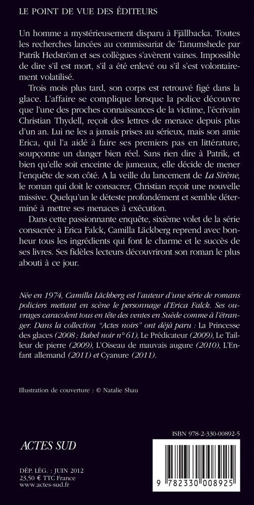 Trois mois plus tard, son corps est retrouvé figé dans la glace. L'affaire se complique lorsque la police découvre que l'une des proches connaissances de la victime, l'écrivain Chris tian Thydell, reçoit des lettres de menace depuis plus d'un an. Lui ne les a jamais prises au sérieux, mais son amie Erica, qui l'a aidé à faire ses premiers pas en littérature, soupçonne un danger bien réel. Sans rien dire à Patrik, et bien qu'elle soit enceinte de jumeaux, elle décide de mener l'enquête de son côté. A la veille du lancement de «La Sirène», le roman qui doit le consacrer, Christian reçoit une nouvelle missive. Quelqu'un le déteste profondément et semble déterminé à mettre ses menaces à exécution.
