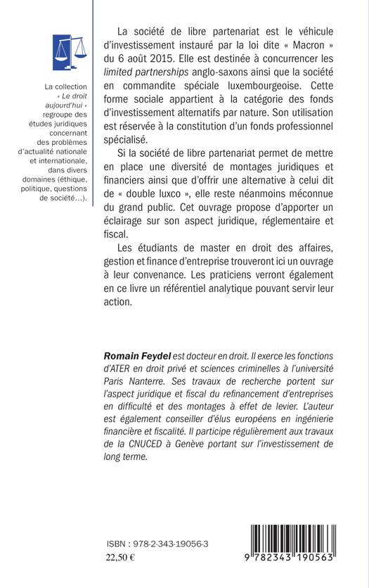 La société de libre partenariat est le véhicule d'investissement instauré par la loi dite « Macron » du 6 août 2015. Elle est destinée à concurrencer les limited partnerships anglo-saxons ainsi que la société en commandite spéciale luxembourgeoise. Cette forme sociale appartient à la catégorie des fonds d'investissement alternatifs par nature. Son utilisation est réservée à la constitution d'un fonds professionnel spécialisé. Si la société de libre partenariat permet de mettre en place une diversité de montages juridiques et financiers ainsi que d'offrir une alternative à celui dit de « double luxco », elle reste méconnue. Cet ouvrage propose d'apporter un éclairage sur son aspect juridique, réglementaire et fiscal.