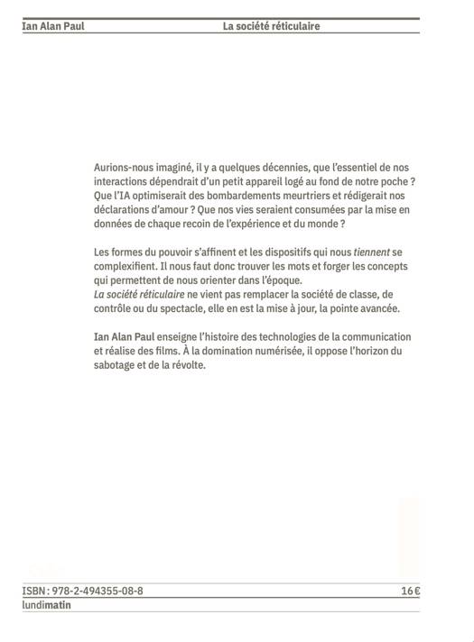 Aurions-nous cru, il y a 60 ans, que l'essentiel de nos interactions seraient médiatisées par un appareil au fond de notre poche ? Que l'IA programmerait des bombardements ? Qu'un soulèvement comme les gilets jaunes démarrerait sur facebook ? La Société réticulaire actualise l'ouvrage fondateur de Guy Debord. Désormais, la société capitaliste domine les vies par la circulation de l'information en ligne. Ian Alan Paul actualise la critique de notre relation constante au numérique, assumant que celle-ci redéfinit entièrement les formes de la vie, de la mort, de la présence, du politique. En un style incisif, l'ouvrage dessine des voies de sortie par le détournement, l'autonomie, la révolte.