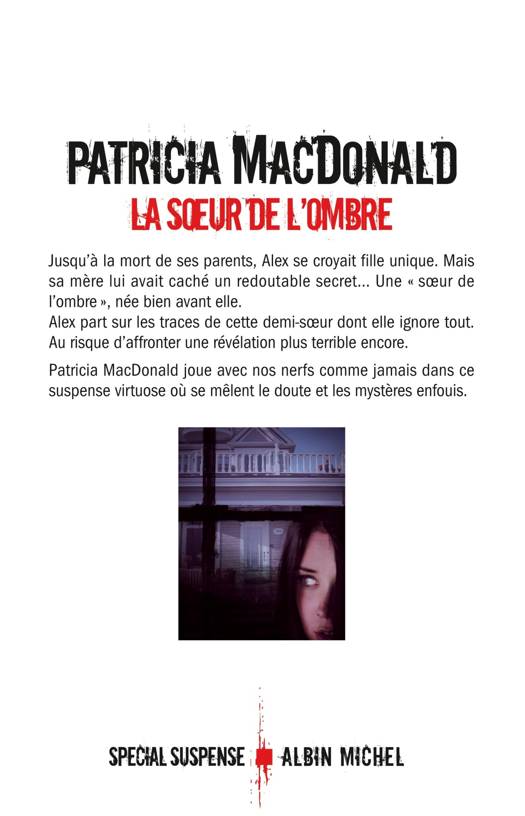 Quand ses parents meurent dans un accident de voiture, Alex se retrouve seule au monde. Jusqu'à la lecture d'une lettre que lui remet le notaire où elle apprend l'incroyable secret que cachait sa mère : bien avant Alex, elle a donné naissance à une fille, confiée à une famille adoptive. Sous le choc, Alex part sur les traces de cette « soeur de l'ombre ». Elle la découvre en prison, accusée d'un meurtre dont elle se déclare innocente. Prenant fait et cause pour elle, Alex décide de l'aider et de mener sa propre enquête. Mais peu à peu, les doutes l'assaillent, et quand tout à coup, c'est sa vie qui se trouve en danger, il lui faut se résoudre à affronter les secrets obsédants du passé... Avec Patricia MacDonald, il ne faut jamais se fier aux apparences. Semant le trouble en virtuose, jouant avec nos peurs inavouées, elle se révèle dans ce nouveau suspense au sommet de son art.
