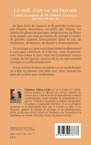 Ce beau livre de citations et de pensées écrites par nos illustres devanciers, recueillis par l'auteur, est illustré de photos de paysages, de personnes, de fleurs et de plantes, qui vous permettra de voyager à travers de grandes sagesses intemporelles faites de joie, de méditation, de douceur, de beauté et d'introspection. Un ouvrage qui peut contribuer même modestement à votre paix intérieure, et si besoin, vous réconcilier avec vous-même et avec votre environnement tenant compte du fait que les chemins de la vie sont souvent escarpés et truffés d'embuches. Il faut cultiver le beau car même sur un tas de fumier on a déjà vu pousser une belle rose. Alors, buvons les mots de ce livre sans modération.