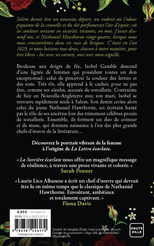 Brodeuse aux doigts de fée, Isobel Gamble descend d'une lignée de femmes qui possèdent toutes un don exceptionnel : celui de percevoir la couleur des lettres et des sons. Très tôt, elle apprend à le cacher, pour ne pas être, comme ses aïeules, accusée de sorcellerie. Contrainte de fuir en Nouvelle-Angleterre avec son mari, Isobel se retrouve rapidement seule à Salem. Son destin croise alors celui du jeune Nathaniel Hawthorne, un écrivain hanté par le rôle de ses ancêtres lors des tristement célèbres procès de sorcellerie. Ensemble, ils forment un duo de conteur et de muse, qui donnera naissance à l'un des plus grands chefs-d'oeuvre de la littérature...