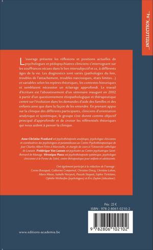 L'ouvrage présente les réflexions et positions actuelles de psychologues et pédopsychiatres cliniciens s'interrogeant sur les souffrances vécues dans le lien intersubjectif et ce, à différents âges de la vie. Les diagnostics sont variés et variables selon les repères théoriques, les contextes historiques et semblaient nécessiter un éclairage approfondi. Un livre dont l'objectif principal est d'approfondir et de croiser les référentiels théoriques qui aident à penser la clinique.
