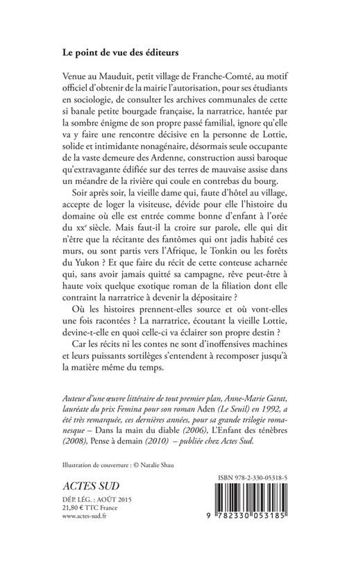 Soir après soir, la vieille dame qui, faute d'hôtel au village, accepte de loger la visiteuse, dévide pour elle l'histoire du domaine où elle est entrée comme bonne d'enfant à l'orée du xxe siècle. Mais faut-il la croire sur parole, elle qui dit n'être que la récitante des fantômes qui ont jadis habité ces murs, ou sont partis vers l'Afrique, le Tonkin ou les forêts du Yukon ? Et que faire du récit de cette conteuse acharnée qui, sans avoir jamais quitté sa campagne, rêve peut-être à haute voix quelque exotique roman de la filiation dont elle contraint la narratrice à devenir la dépositaire ?