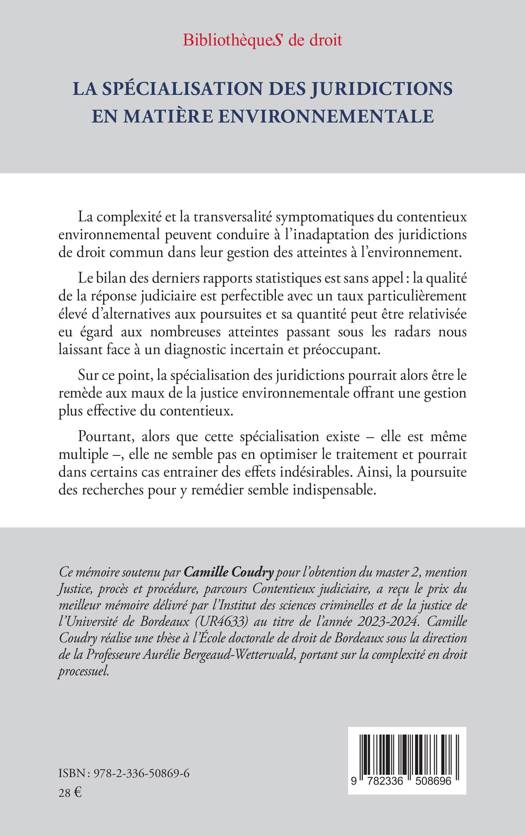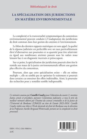 La complexité et la transversalité symptomatiques du contentieux environnemental peuvent conduire à l'inadaptation des juridictions de droit commun dans leur gestion des atteintes à l'environnement. Le bilan des derniers rapports statistiques est sans appel la qualité de la réponse judiciaire est perfectible avec un taux particulièrement élevé d'alternatives aux poursuites et sa quantité peut être relativisée eu égard aux nombreuses atteintes passant sous les radars nous laissant face à un diagnostic incertain et préoccupant. Sur ce point, la spécialisation des juridictions pourrait alors être le remède aux maux de la justice environnementale offrant une gestion plus effective du contentieux. Pourtant, alors que cette spécialisation existe - elle est même multiple -, elle ne semble pas en optimiser le traitement et pourrait dans certains cas entrainer des effets indésirables. Ainsi, la poursuite des recherches pour y remédier semble indispensable.