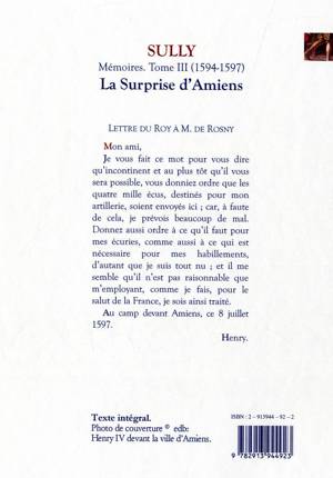Dernier volume des mémoires de Sully, le puissant ministre des Finances d'Henry IV, recouvrant la période située entre 1594 et 1597. Oeuvre de justification de son action économique et politique, ces chroniques sont une source essentielle pour l'histoire du XVIe siècle, évoquant ses guerres religieuses et la mutation de la France en puissance mondiale.