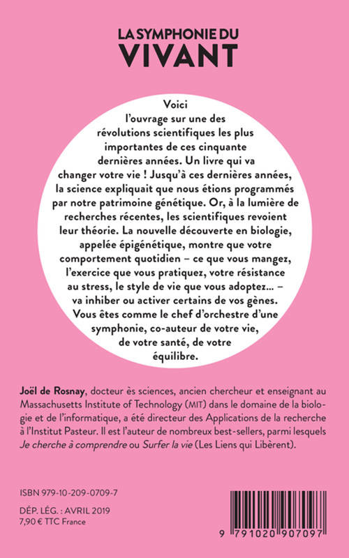 Voici l'ouvrage sur une des révolutions scientifiques les plus importantes de ces cinquante dernières années. Un livre qui va changer votre vie ! Jusqu'à ces dernières années, la science expliquait que nous étions programmés par notre patrimoine génétique. Or, à la lumière de recherches récentes, les scientifiques revoient leur théorie. La nouvelle révolution en biologie, appelée épigénétique, montre que votre comportement quotidien - ce que vous mangez, l'exercice que vous pratiquez, votre résistance au stress, le style de vie que vous adoptez... - va inhiber ou activer certains de vos gènes. Vous êtes comme le chef d'orchestre d'une symphonie, co-auteur de votre vie, de votre santé, de votre équilibre. Joël de Rosnay raconte cette révolution et ses répercussions sur le « vivant ». Il dispense également de nombreux conseils pour prendre soin de son environnement personnel, et ainsi rester en bonne santé. Par ailleurs, il élargit cette notion, fondée sur l'interdépendance entre individu et environnement, à la société tout entière. Il dessine les fondements du monde de demain en imaginant le passage d'une démocratie représentative à une démocratie participative, et enjoint les nouvelles générations à faire le pari de moins de compétition et de plus d'optimisme. Il décrit des citoyens engagés à tous les niveaux de décision (politique, économique, sociétal...) et l'avènement d'une économie plus collaborative et « circulaire ». Ce livre fondamental veut inciter le lecteur à réfléchir aux impacts de cette révolution majeure dans la manière de construire sa vie personnelle et de décider des futures évolutions sociétales. Par l'auteur de nombreux best-seller, comme «Je cherche à comprendre» (plus de 15.000 ex).