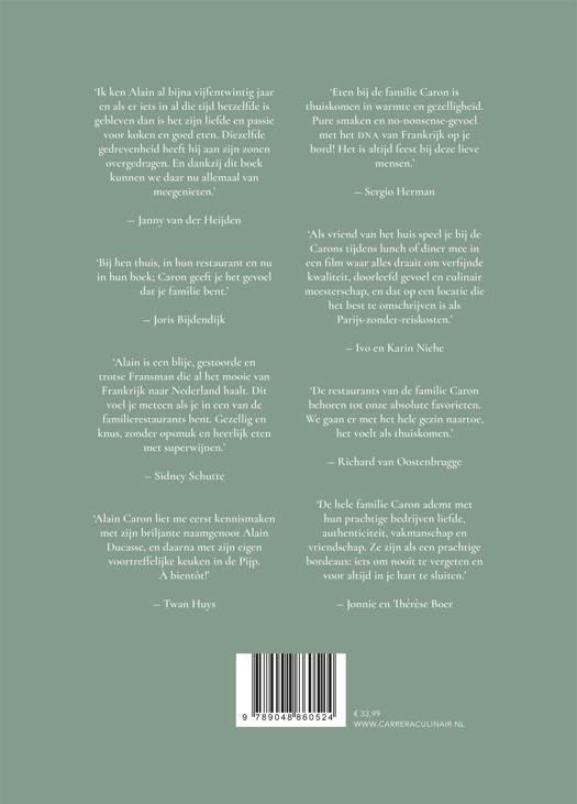Wie uit eten gaat bij de familie Caron waant zich hartje Amsterdam in Parijs. Werkelijk alles is er zoals je verlangt van een moderne, kwalitatief hoogstaande bistro. Van de sfeer tot aan het personeel en het typerende servies en meubilair, maar bovenal de elegante gerechten waar ongetwijfeld nog lang over nagepraat zal worden.