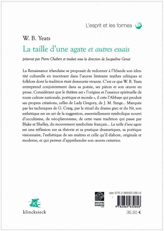 La Renaissance irlandaise se proposait de redonner a l'Irlande son identite culturelle en inscrivant dans l'oeuvre litteraire mythes celtiques et folklore dont la tradition etait demeuree vivante. C'est ce que W.B. Yeats entreprend conjointement dans sa poesie, ses pieces et son oeuvre en prose. Considerant que le theatre est " l'origine et l'essence spirituelle de toute culture nationale, poetique et morale ", il cree l'Abbaye qui produit ses propres creations, celles de Lady Gregory, de J.M. Synge... Marquee par les techniques de G. Craig, par le rituel du drame grec et du No, son esthetique est un art de la suggestion, essentiellement symbolique nourri d'occultisme, de neo-platonisme, de cette vaste tradition qui passe par Blake et Shelley, du mouvement symboliste francais... La Taille d'un agate et une reflexion sur sa theorie et sa pratique dramatiques, sa poetique visionnaire, l'esthetique de ses maitres et celle qu'il elabore, originale et moderne, et qui permet d'apprehendre son oeuvre creatrice.