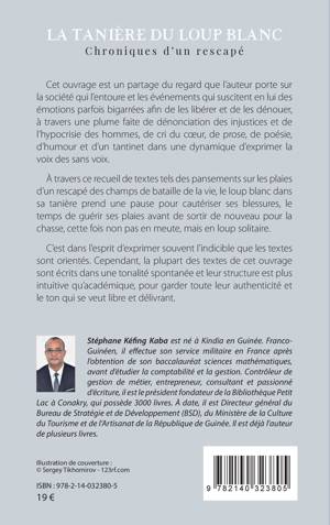 Cet ouvrage est un partage du regard que l'auteur porte sur la société qui l'entoure et les événements qui suscitent en lui des émotions parfois bigarrées afin de les libérer et de les dénouer, à travers une plume faite de dénonciation des injustices et de l'hypocrisie des hommes, de cri du coeur, de prose, de poésie, d'humour et d'un tantinet dans une dynamique d'exprimer la voix des sans voix. À travers ce recueil de textes tels des pansements sur les plaies d'un rescapé des champs de bataille de la vie, le loup blanc dans sa tanière prend une pause pour cautériser ses blessures, le temps de guérir ses plaies avant de sortir de nouveau pour la chasse, cette fois non pas en meute, mais en loup solitaire.