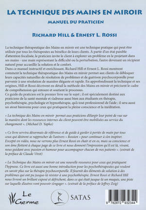 La technique thérapeutique des Mains en miroir est une technique pratique qui peut être utilisée par tous les thérapeutes au bénéfice de leurs clients. A partir d'un état paisible d'attention focalisée, le praticien invite le client à explorer un problème en le projetant dans ses mains - une main représentant la difficulté ou la perturbation, l'autre devenant un récipient naturel pour accueillir la solution et le confort. Dans ce manuel instructif et enrichissant, Richard Hill et Ernest L. Rossi montrent comment la technique thérapeutique des Mains en miroir permet aux clients de débloquer leurs capacités naturelles de résolution de problèmes et de guérison psychocorporelle pour parvenir à une résolution de manière élégante et rapide. En approfondissant la technique et ses origines, Hill et Rossi décrivent en détail la méthode des Mains en miroir et précisent le cadre de compréhension qui entoure et soutient le processus. Ce guide du praticien est le premier livre sur le sujet ; il est spécialement destiné aux praticiens de la santé mentale et s'adresse aussi bien aux étudiants en thérapie, psychothérapie, psychologie et hypnothérapie, qu'à tout professionnel de l'aide ; il sera aussi un atout bienvenu pour ceux qui pratiquent la pleine conscience et la méditation.