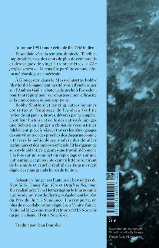 Et soudain, c'est la tempete du siecle. Terrible, impitoyable, avec des vents de plus de cent nuds et des vagues de vingt a trente metres. " The perfect storm " - la tempete parfaite comme dira un meteorologiste americain A Gloucester, dans le Massachusetts, Bobby Shatford a longuement hesite avant d'embarquer sur l'Andrea Gail, un bateau de peche a l'espadon, pourtant repute pour sa robustesse, son efficacite et la competence de son capitaine. Bobby Shatford et les cinq autres hommes constituant l'equipage de l'Andrea Gail ne reviendront jamais, broyes, devores par la tempete. C'est leur histoire et celle des autres equipages que Sebastian Junger a choisi de reconstituer fidelement, piece a piece, a travers les temoignages des survivants et des proches des disparus comme a travers la meticuleuse analyse des donnees techniques et des rapports officiels. Et la vigueur de son style aidant, ce gigantesque travail, debouche a la fois sur un sommet du reportage et sur une authentique et puissante uvre litteraire, tirant de la simple et cruelle realite des faits un recit digne des plus grands livres de fiction.
