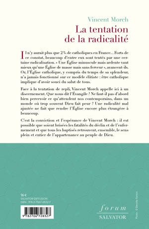 À l'heure où le catholicisme en France traverse une crise et se voit affaiblir par une profonde sécularisation, la tentation peut être grande pour ce « petit reste » de se radicaliser, au delà de l'opposition classique « progressistes/ tradis » Mais si se radicaliser peut signifier un positif « retour » aux racines évangéliques, comme le fit François d'Assise, il peut aussi à l'inverse susciter un repli sectaire, voire violent. Dans cet essai, Vincent Morch appelle à un discernement pour refuser cette tentation. Ne faut il pas d'abord mieux percevoir ce qu'attendent nos contemporains, dans un monde où trop souvent Dieu fait peur, comme s'il allait attenter totalement à notre liberté Parier sur la seule radicalité ne pourra que rendre l'Église encore plus étrangère Voilà pourquoi l'auteur entend s'adresser aux chrétiens engagés du « premier cercle » pour qu'ils se tournent plus largement vers leurs frères à la foi ordinaire.