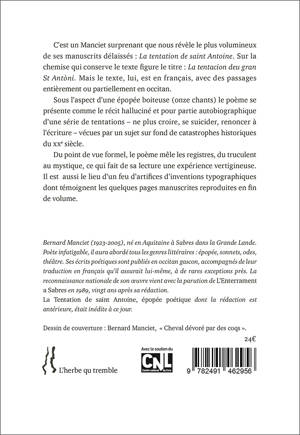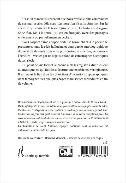 C’est un Manciet surprenant que nous révèle le plus volumineux de ses manuscrits délaissés : La Tentation de saint Antoine. Sur la chemise qui conserve le texte figure le titre : La Tentacion deu gran St Antòni. Mais le texte, lui, est en français, avec des passages entièrement ou partiellement en occitan. Sous l’aspect d’une épopée boiteuse (onze chants) le poème se présente comme le récit halluciné et pour partie autobiographique d’une série de tentations – ne plus croire, se suicider, renoncer à l’écriture – vécues par un sujet sur fond de catastrophes historiques du xxe siècle. Du point de vue formel, le poème mêle les registres, du truculent au mystique, ce qui fait de sa lecture une expérience vertigineuse. Il est aussi le lieu d’un feu d’artifices d’inventions typographiques dont témoignent les quelques pages manuscrites reproduites en fin de volume.