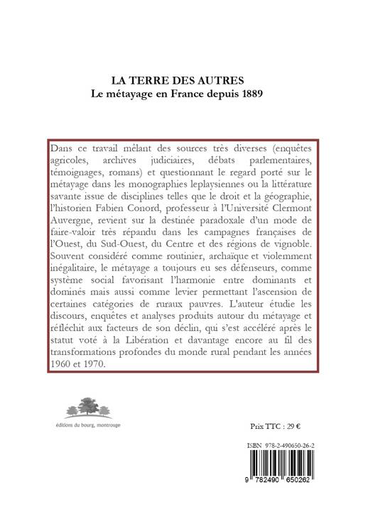 Fabien Conord revient dans cet ouvrage sur la destinée paradoxale d’un mode de faire-valoir très répandu dans les campagnes françaises de l’Ouest, du Sud-Ouest, du Centre et des régions de vignoble. Il fait la synthèse critique de diverses approches scientifiques – études géographiques, monographies leplaysiennes, travaux juridiques – et exploite de nombreuses archives relatives aux conflits et à la jurisprudence autour du régime du métayage. Souvent considéré comme routinier, archaïque et violemment inégalitaire, celui-ci a toujours eu ses défenseurs, qui le voyaient comme un système social favorisant l’harmonie entre les notables et les dominés, mais aussi comme un levier permettant l’ascension de certaines catégories de ruraux pauvres. L'auteur étudie les discours, enquêtes et analyses produits autour du métayage et réfléchit aux facteurs de son déclin qui s’est accéléré après le vote d’un statut, à la Libération, puis au fil des grandes transformations qu’a connues le monde rural pendant les années 1960 /1970. Après une première édition publiée en 2018 et aujourd’hui épuisée, l’ouvrage reparaît dans une édition révisée, augmentée d’une postface inédite qui intègre les travaux récents de l’auteur et prolonge les pistes de lecture ouvertes par les nombreuses recensions de la version initiale de ce livre.