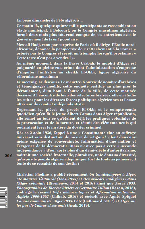 Un beau dimanche de l'été algérois... Ce matin-là, quelque quinze mille participants se rassemblent au Stade municipal, à Belcourt. Débarqué à l'aube, Messali Hadj, dirigeant en métropole de l'Étoile nord-africaine, impose par surprise sa présence au meeting. Au même moment, dans la Basse Casbah, le grand muphti d'Alger est poignardé en pleine rue. Le meeting. Le discours. Le meurtre... Nourri de nombreuses archives ou témoignages inédits, cette enquête restitue minute par minute, le déroulement, d'une extrémité à l'autre de la ville, de cette matinée décisive.