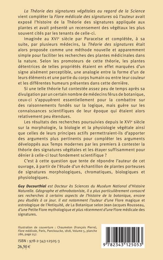 Cet ouvrage complète la « Flore médicale des signatures ». Imaginée au XVIe siècle par Paracelse, la Théorie des signatures était proposée comme une méthode nouvelle pour faciliter les recherches des plantes médicinales dans la nature. Selon cette théorie, les plantes avec ces propriétés étaient marquées d'un signe aisément perceptible, une analogie entre ses parties et le corps humain ou entre une couleur et une humeur. L'auteur s'appuie sur les résultats de la recherche pour argumenter à l'encontre de cette théorie.