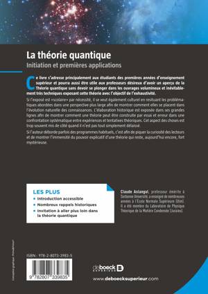 Ce livre est un cours clair et accessible de la théorie quantique. Si l’exposé est "scolaire" par nécessité, il est également culturel en resituant les problématiques abordées dans une perspective plus large afin de montrer comment elles se placent dans l’évolution naturelle des connaissances. Notamment, l’élaboration historique de la mécanique quantique est exposée dans ses grandes lignes afin de montrer comment une théorie peut être construite par essai et erreur dans une confrontation systématique entre expériences et tentatives théoriques.