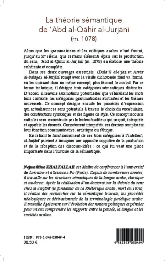Alors que les grammairiens et les critiques arabes n'ont fourni, jusqu'au XIe siècle, que certains éléments épars sur la production du sens, al-Jurjani, fondateur de la Rhétorique arabe, en élabore une théorie cohérente et complète. Dans deux ouvrages essentiels, il rompt avec la dichotomie fonds vs. forme, en les unissant dans un même concept, le ma'na. Il inaugure une approche cognitive de la production et de la réception des discours-idées, ce qui lui vaut une place importante dans l'histoire de la sémantique.