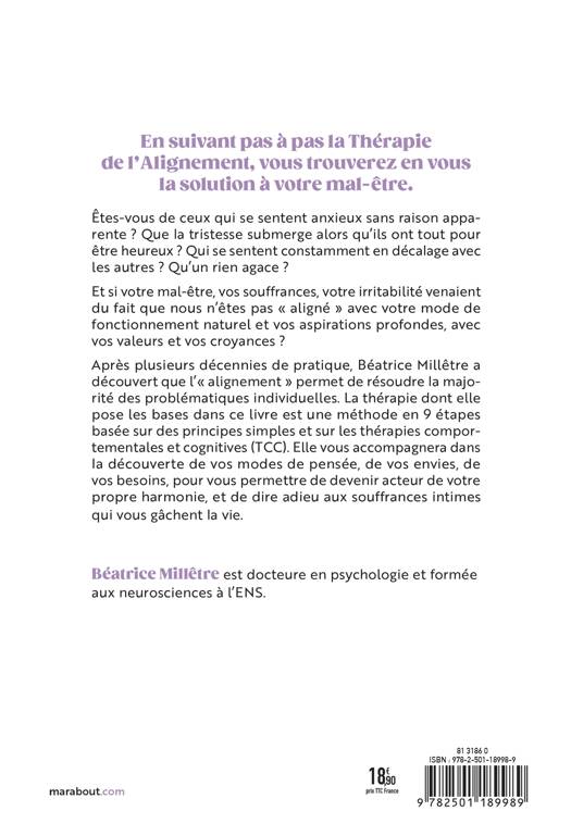 Après plusieurs décennies de pratique, Béatrice Millêtre a découvert que l’« alignement » permet de résoudre la majorité des problématiques individuelles. La thérapie dont elle pose les bases dans ce livre est une méthode en 9 étapes basée sur des principes simples et sur les thérapies comportementales et cognitives (TCC). Elle vous accompagnera dans la découverte de vos modes de pensée, de vos envies, de vos besoins, pour vous permettre de devenir acteur de votre propre harmonie, et de dire adieu aux souffrances intimes qui vous gâchent la vie.