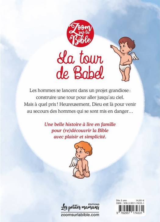Zoom sur la Bible, c’est LA série qui raconte la Bible aux 5-10 ans. Voilà une vraie innovation dans la littérature jeunesse : des albums qui associent avec brio la modernité du format « série » et le respect du récit biblique. Une série pour lire la Bible…sans en avoir l’air ! Avec ce quatrième épisode nous découvrons ce qui arrive à Noé après le déluge. Les hommes se lancent dans un projet grandiose : construire une tour pour aller jusqu’au ciel. Mais à quel prix ! Heureusement, Dieu est là pour venir au secours des hommes qui se sont mis en danger…..