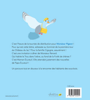 C'est l'heure de la tournée pour Monsieur Pigeon ! Il ne faut oublier personne, car chaque habitant de la forêt et de ses environs est pressé de recevoir son courrier. Pour qui est cette lettre, adressée au «Sommet de la première tour», «lieu-dit Château du lac» ? Pour la famille Cigogne, assurément ! C'est une invitation à dîner de Monsieur Renard. Qui habite au «3 creux de l'arbre, 303-03 Forêt-de-Chênes »? C'est Maman Écureuil, accompagnée de ses trois petits ! Elle attendait justement des nouvelles de Papa Écureuil.