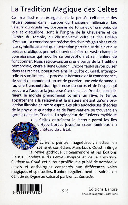 Ce livre illustre la résurgence de la pensée celtique et des rituels païens dans l'Europe du troisième millénaire. Les valeurs du druidisme, porteuses de force et d'harmonie, de joie et d'équilibre, sont à l'origine de la Chevalerie et de l'Ordre du Temple, du christianisme celte et des Fidèles d'Amour. La connaissance précise des divinités gauloises et de leur symbolique, ainsi que l'attention portée aux rituels et aux prières druidiques permet d'ouvrir en l'être un vaste champ de connaissance qui modifie sa perception et sa manière de fonctionner. Nous retrouvons ainsi une partie de la Tradition primordiale, chère à René Guénon. Encore faut-il savoir puiser dans ses racines, poursuivre ainsi la Quête du Graal, intemporelle et sans limites. Le processus héroïque de la connaissance, de soi et du monde est un art de guerrier, une voie de samouraï, une transmutation rigoureuse du corps et de l'esprit qui procure à l'adepte la jeunesse éternelle. Les Druides considéraient le monde phénoménal comme un rêve, le temps appartenant à la relativité et la matière n'étant qu'une projection illusoire de notre esprit. Les plus audacieuses théories de la physique quantique et de l'anti-matière se trouvent en germe dans les Triades. La splendeur de l'univers mythique des Celtes entraînera le lecteur parmi les îles d'Hyperborée, jusqu'au coeur lumineux du château de cristal.