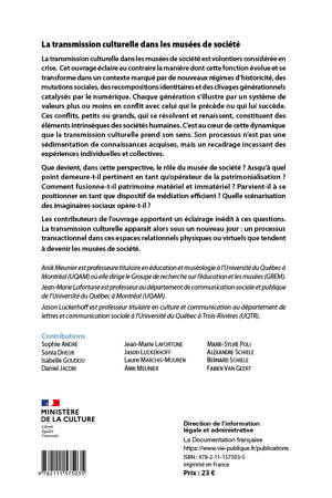 Cet ouvrage offre trois parcours thématiques. Il invite le lecteur à prendre connaissance des différentes stratégies muséales, du fonctionnement des expositions et des modalités sous lesquelles se présente la médiation. Puis, aborde la transmission culturelle sur le terrain et les enjeux tels le processus de patrimonialisation, le développement de la perspective historienne, spécialement en contexte scolaire. Enfin, il formule des propositions visant à cadrer la transmission culturelle dans les musées sur le plan conceptuel ; peu à peu constitué comme modèle pour une grande variété d’institutions muséales, le musée de société y est situé dans l’évolution des régimes de muséalité depuis la Renaissance.