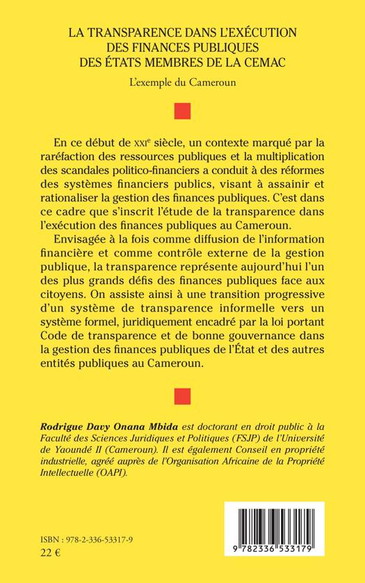 En ce début de XXIe siècle, un contexte marqué par la raréfaction des ressources publiques et la multiplication des scandales politico-financiers a conduit à des réformes des systèmes financiers publics, visant à assainir et rationaliser la gestion des finances publiques. C'est dans ce cadre que s'inscrit cette étude sur la transparence en droit de la comptabilité publique au Cameroun. Envisagée à la fois comme diffusion de l'information financière et comme contrôle externe de la gestion publique, la transparence représente aujourd'hui l'un des plus grands défis des finances publiques face aux citoyens. On assiste ainsi à une transition progressive d'un système de transparence informelle vers un système formel, juridiquement encadré par la loi portant Code de transparence et de bonne gouvernance dans la gestion des finances publiques de l'État et des autres entités publiques au Cameroun.