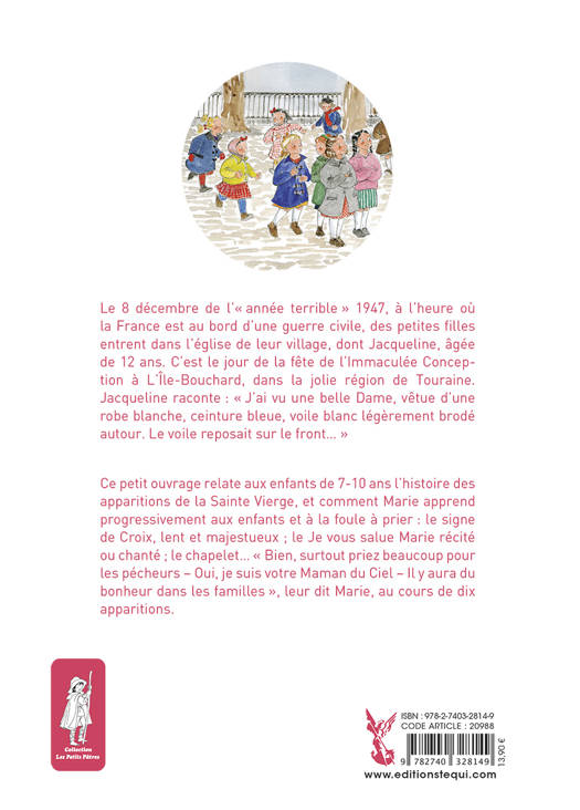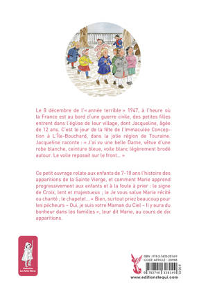 Le 8 décembre de l'« année terrible » 1947, à l'heure où la France est au bord d'une guerre civile, des petites filles entrent dans l'église de leur village, dont Jacqueline, âgée de 12 ans. C'est le jour de la fête de l'Immaculée Conception à L'Île-Bouchard, dans la jolie région de Touraine. Jacqueline raconte : « J'ai vu une belle Dame, vêtue d'une robe blanche, ceinture bleue, voile blanc légèrement brodé autour. Le voile reposait sur le front... » Ce petit ouvrage relate aux enfants l'histoire des apparitions de la Sainte Vierge, et comment Marie apprend progressivement aux enfants et à la foule à prier : le signe de Croix, lent et majestueux – le Je vous salue Marie récité ou chanté – le chapelet... « Bien, surtout priez beaucoup pour les pécheurs – Oui, je suis votre Maman du Ciel – Il y aura du bonheur dans les familles », leur dit Marie, au cours de dix apparitions.